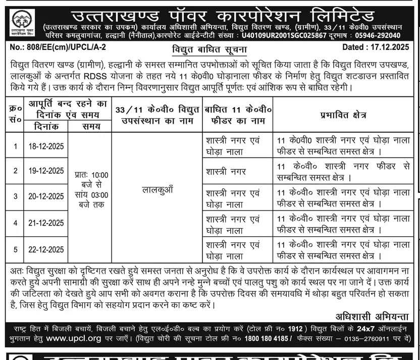 बिंदुखत्ता में बिजली कटौती की सूचना