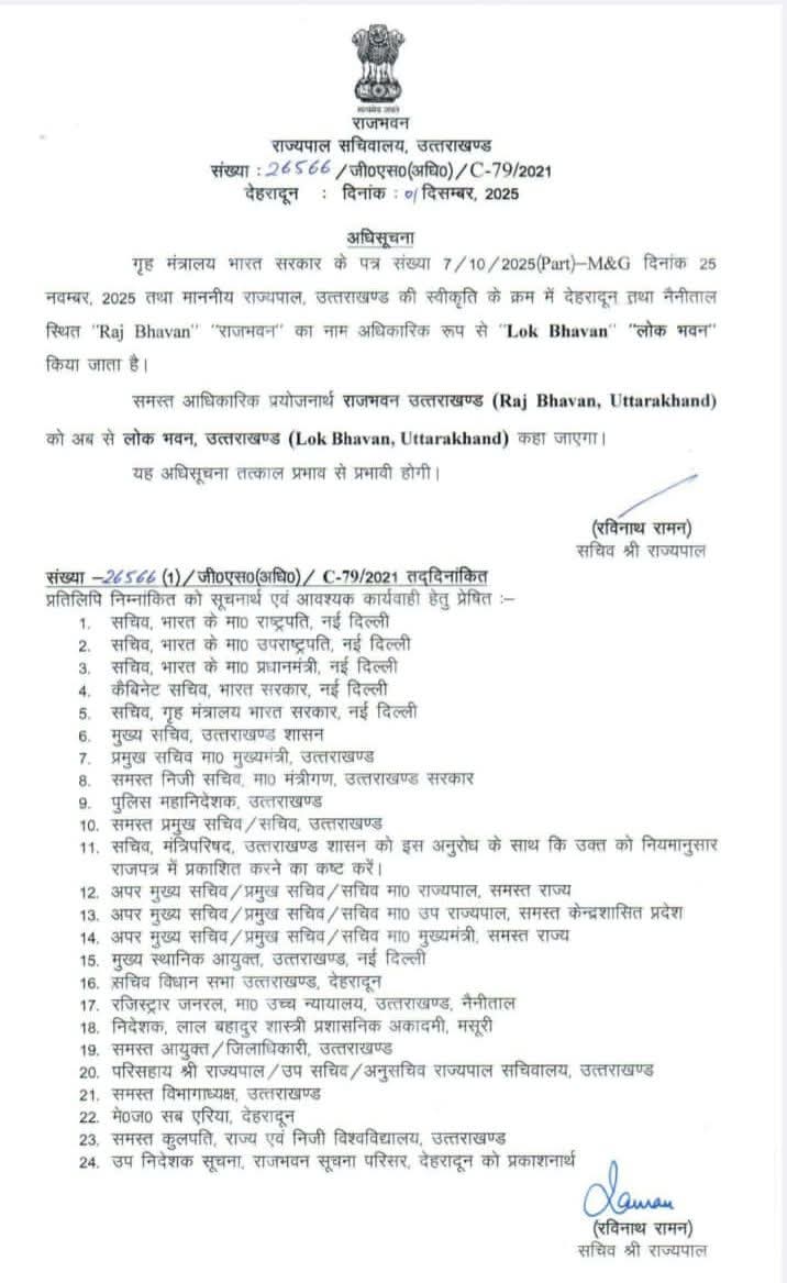 देहरादून: उत्तराखंड सरकार ने एक महत्वपूर्ण निर्णय लेते हुए राजभवन का नाम बदलकर ‘लोक भवन’ कर दिया है। सरकार की ओर से जारी आदेश के बाद अब राजभवन सभी आधिकारिक दस्तावेज़ों, पट्टिकाओं और संचार में लोक भवन नाम से ही जाना जाएगा।